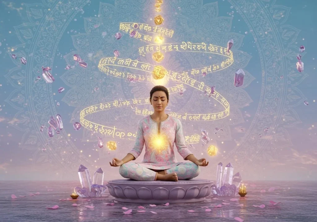 Mantras create vibrational resonance in the body, influencing chakras, nervous system, and energy channels. Each syllable carries specific qualities; for example, chanting “Om” vibrates the chest, throat, and entire body. Repetition rewires the brain, replacing limiting patterns with positive neural pathways. The rhythmic chanting synchronizes brainwaves, reduces stress hormones, and enhances emotional and mental clarity.
